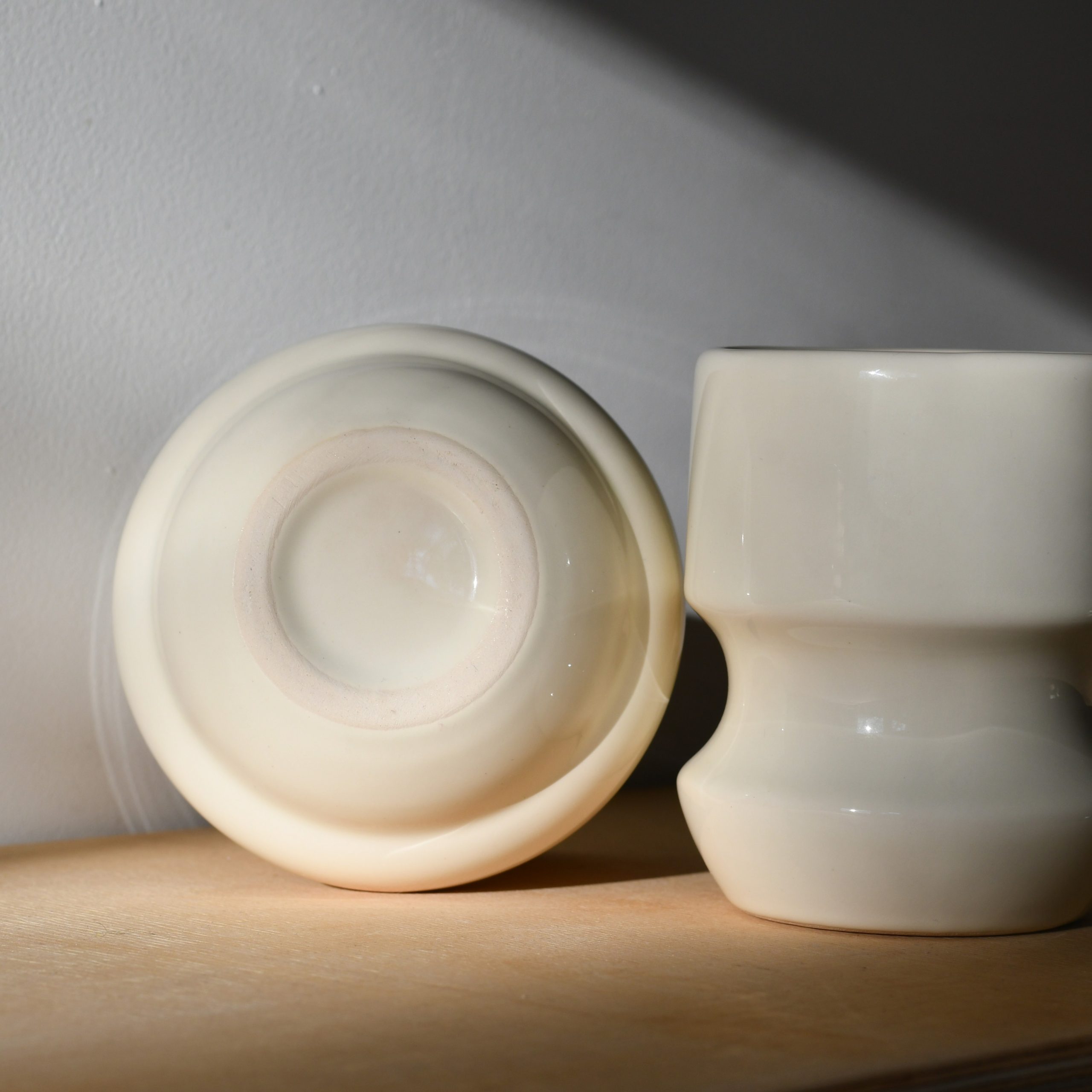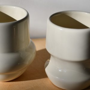 Para kubków ceramicznych beżowych. Kubki mają szkliwione spody.