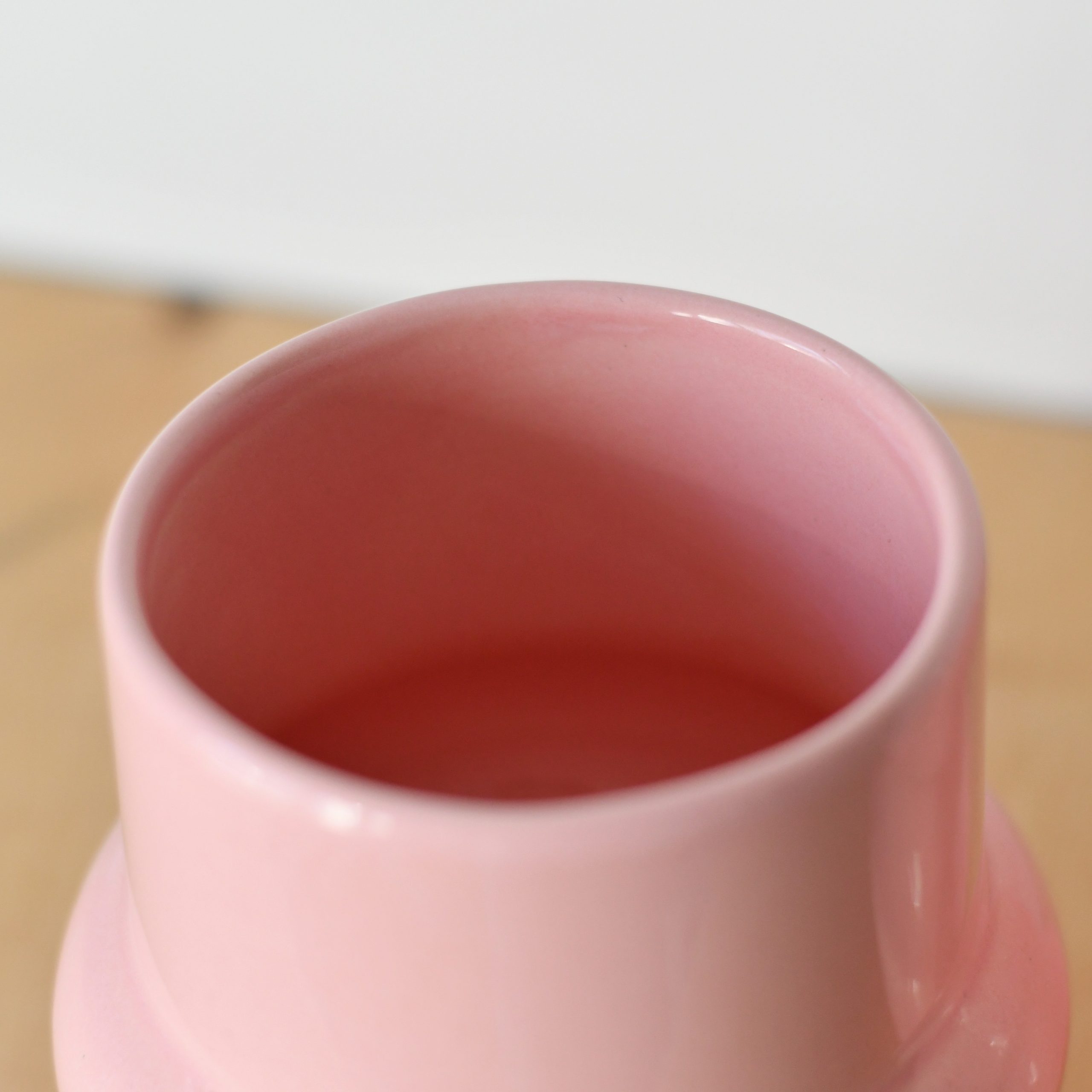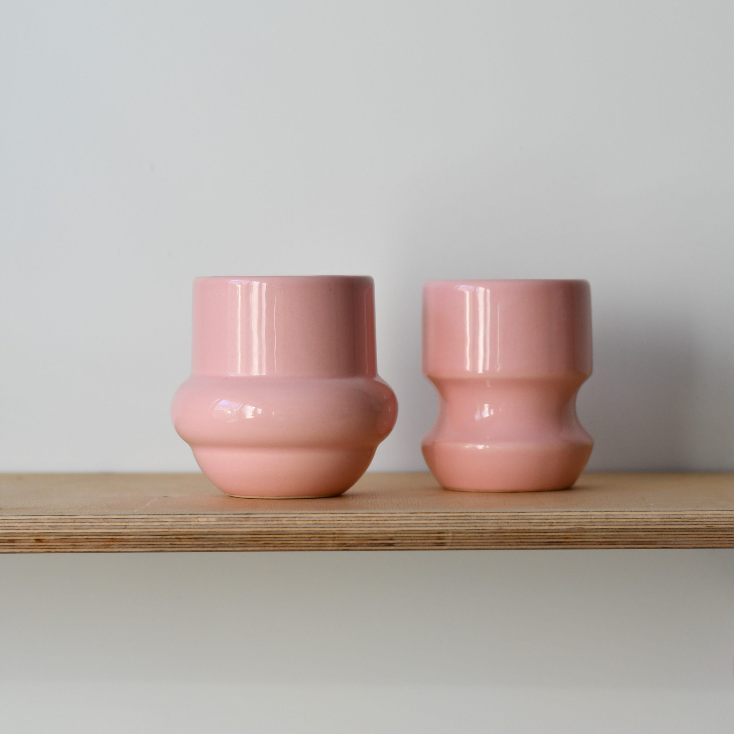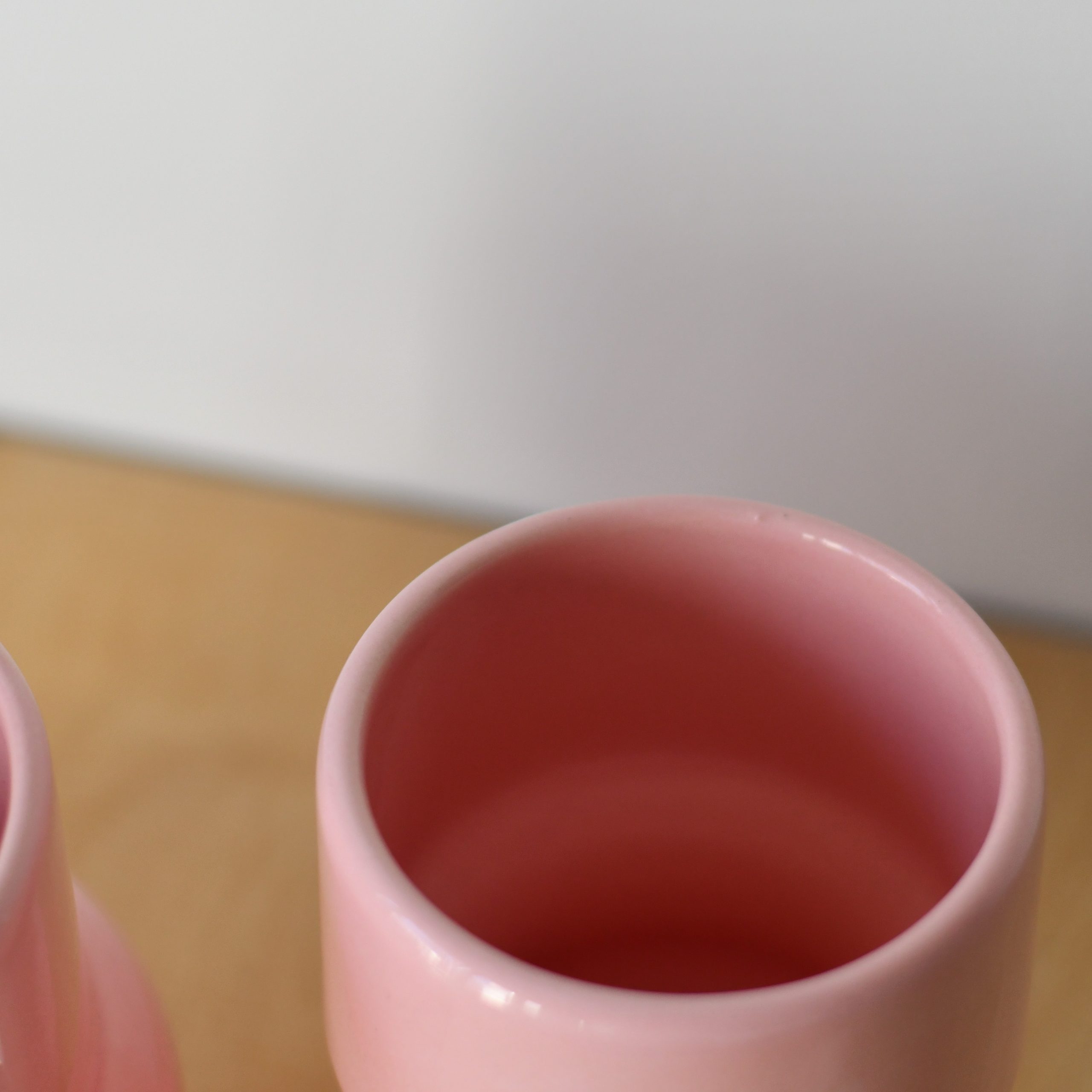 Para kubków ceramicznych różowych . Kubki mają szkliwione spody.